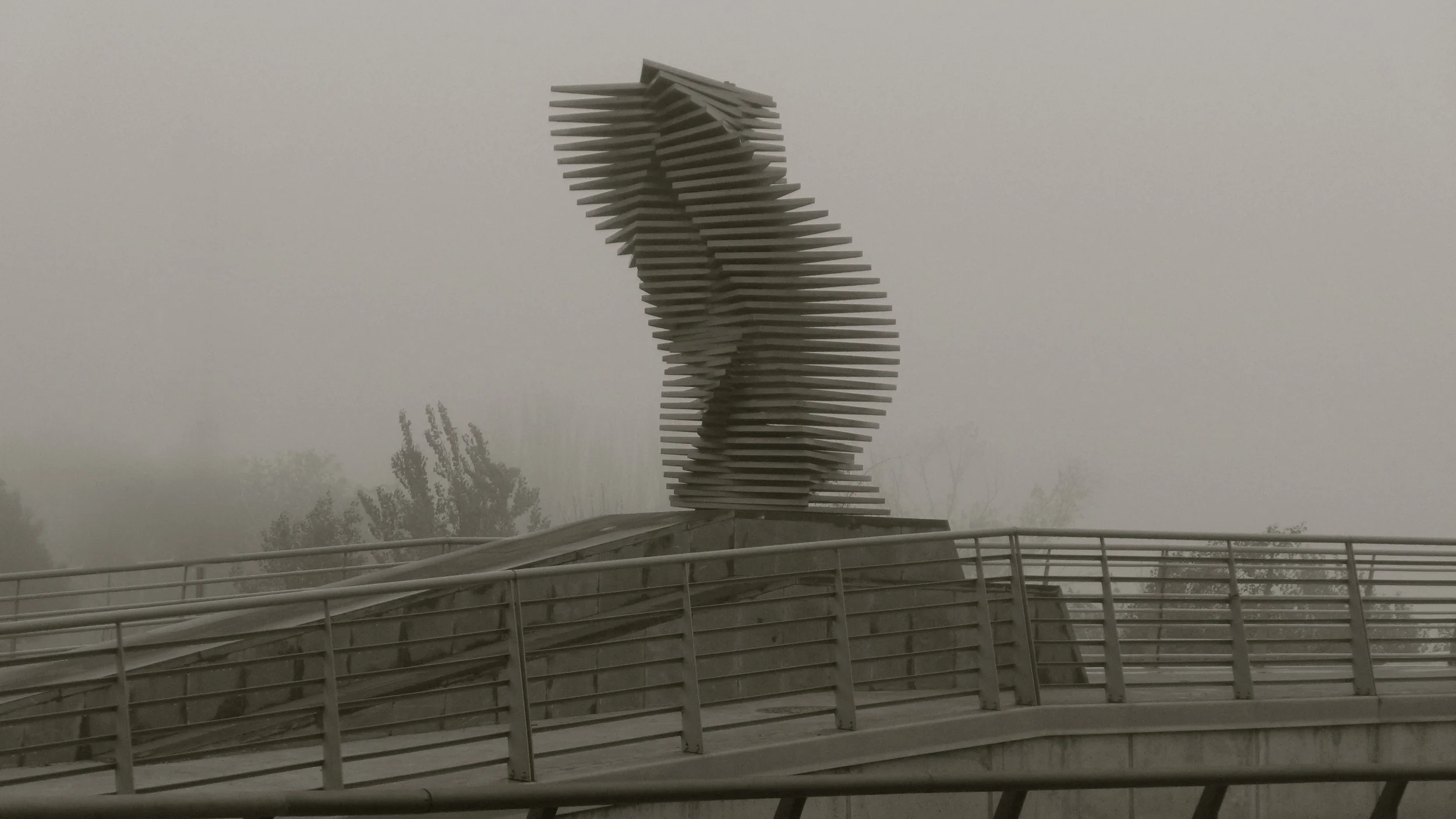 Quetzal es el nombre de la escultura de Antonio Martínez Santoja que preside el Puente de la Almozara sobre el río Ebro en Ailanthus Zity. Lo he fotografiado varias veces pero es con niebla como más me gusta.