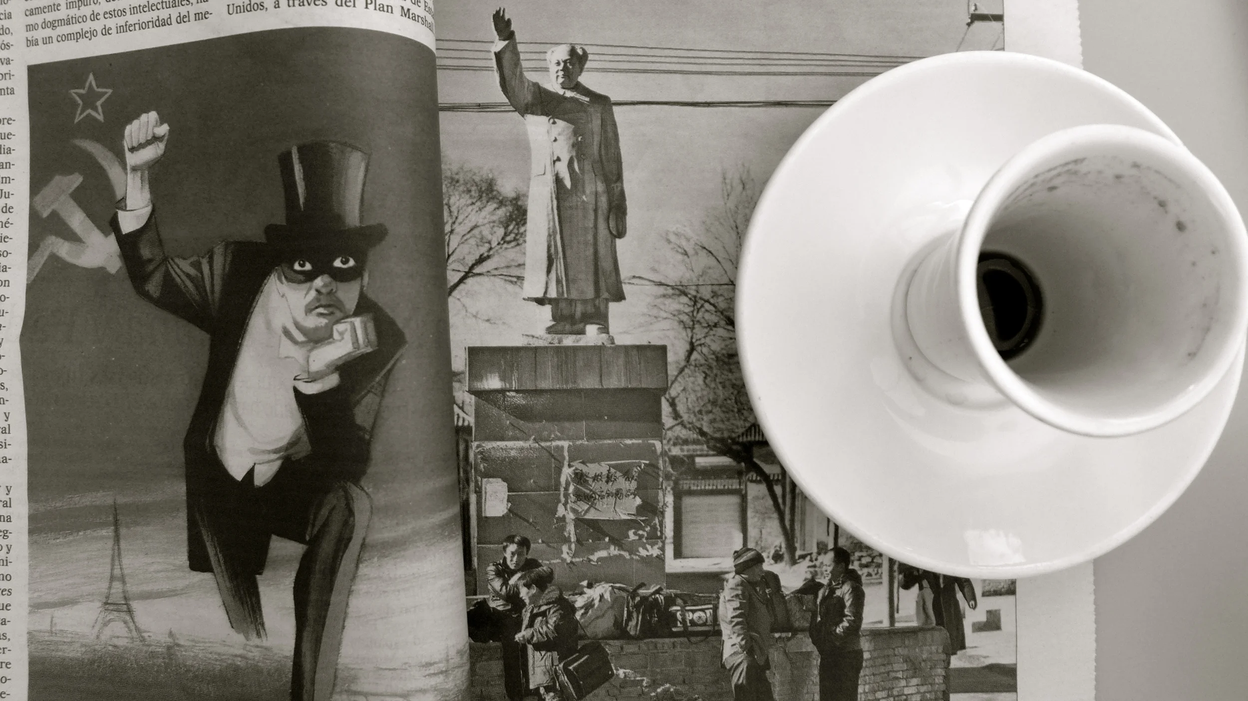 Bueno, que me enrollo. Lo que quería decir es que algunas veces el collage viene resuelto en las páginas del periódico. Sin tener si quiera que rasgar, una ilustración de Fernando Vicente, que acompaña un artículo de Vargas Llosa, se empareja con una fotografía de China y ¡ya está!. Yo no he hecho nada, solo me he tomado un café.