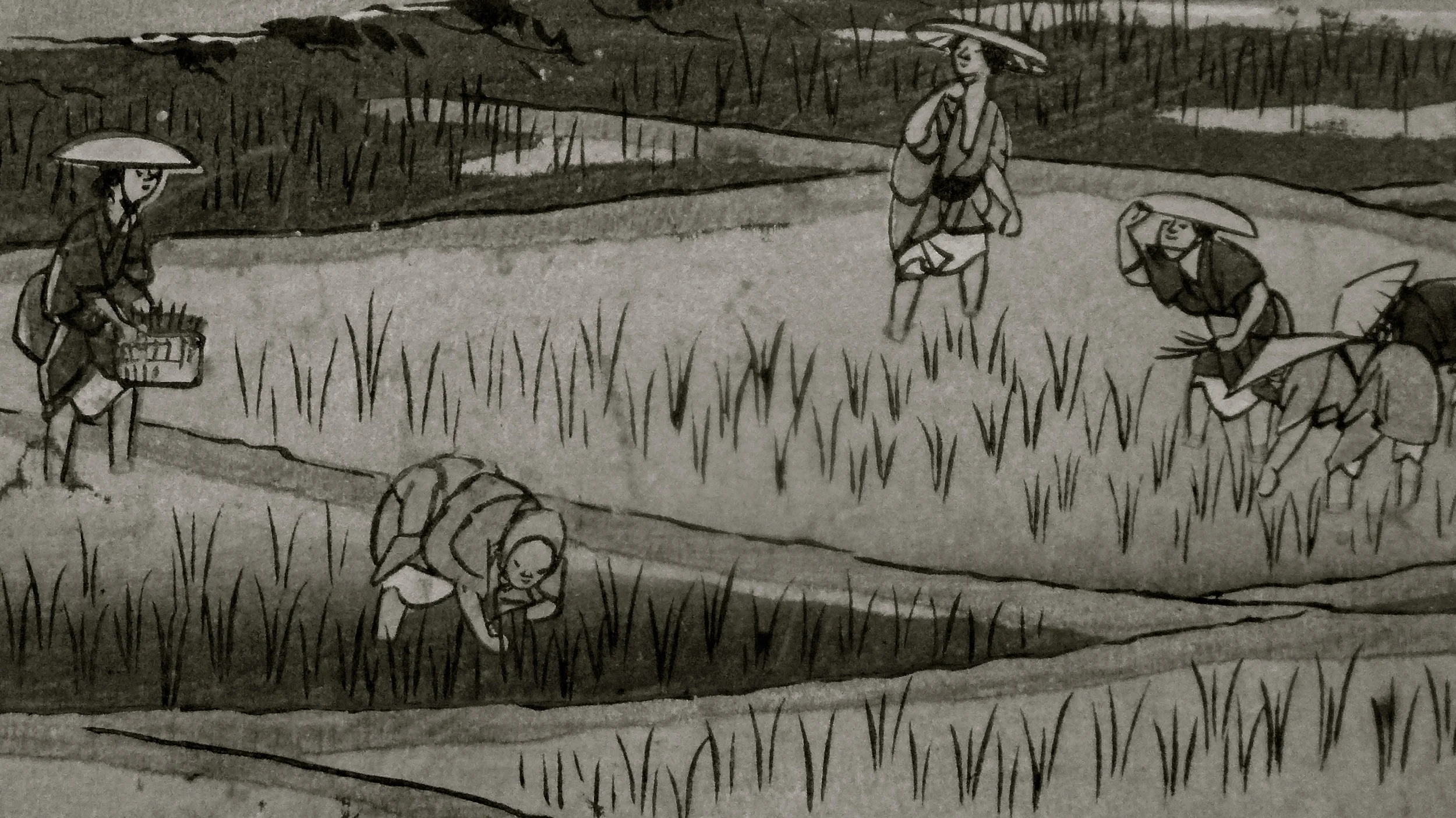 La familia de Toa también cultiva arroz en terrazas escalonadas como estos personajes de Hiroshige.