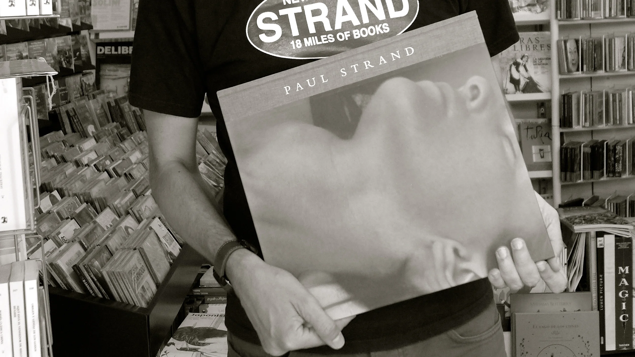 Ayer recibí dos correos electrónicos que me invitaban a la exposición de Paul Strand en la Sala Bárbara de Braganza, de la Fundación Mapfre, en Madrid. El motivo, la fotografía, que ilustraba la invitación era el mismo, pero de diferente tamaño. Me pareció que había foto de foto, y disparé. Hoy, en la Librería Antígona he coincidido con el amigo David Mayor, el poeta que siempre viste originales T-shirt (juro que esto no estaba preparado), y con el magnífico catálogo de Strand.