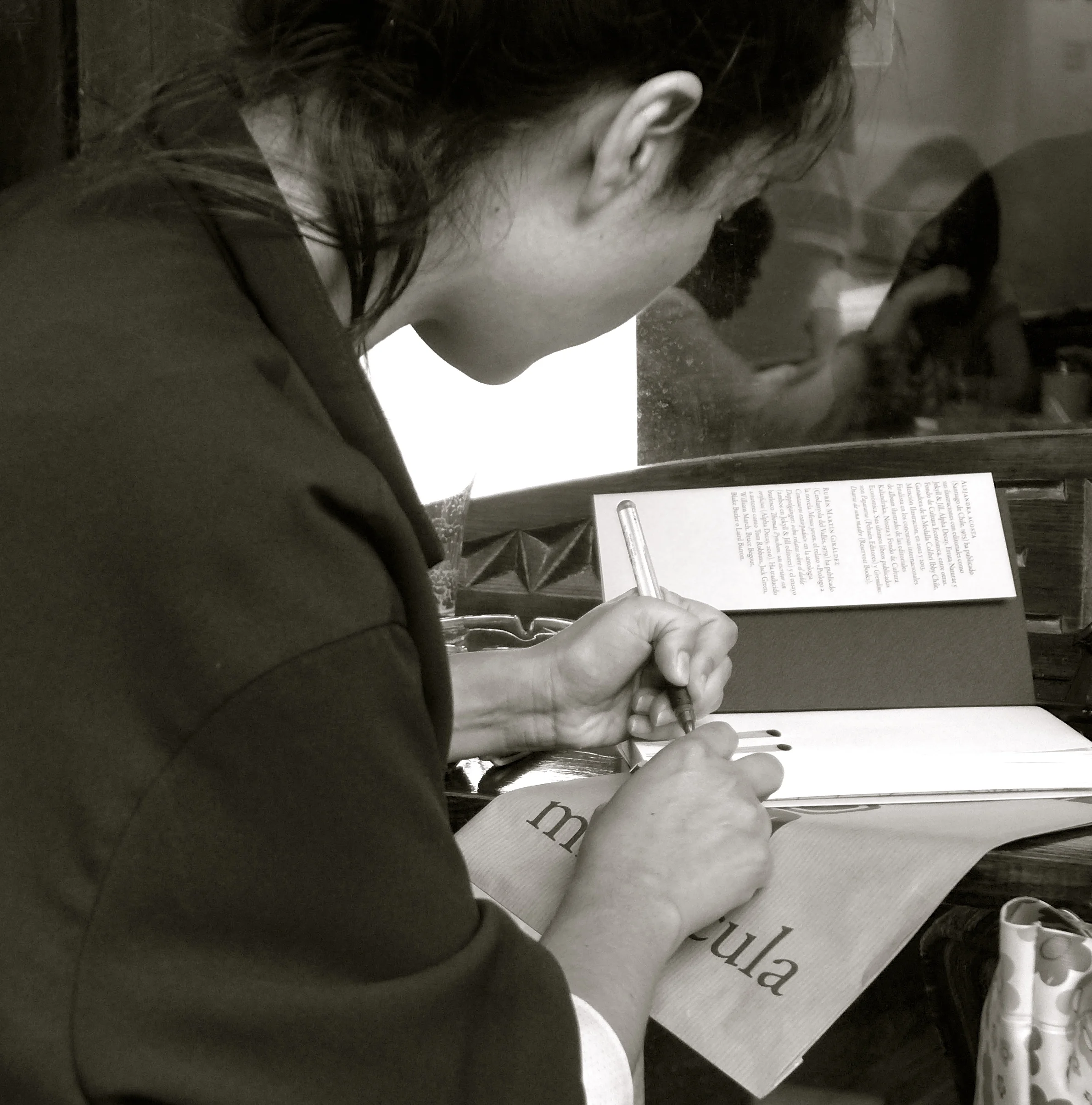 Quise sorprender a Alejandra Acosta mientras dedicaba el último libro que ha ilustrado: Cosmotheoros, de Christiaan Huygens de ediciones Jekyll & Jill. Estaba de espaldas y rodeada de gente. Esperaba que en un instante se girase su cabeza para fotografiar su rostro. Como la respuesta de la cámara es lenta, fui disparando a ráfagas en espera del instante mágico pero este no se produjo. Si no hubiese visto recientemente la fotografía "Tres hombres" de Schapiro, lo más seguro, hubiese borrado esta foto. Ahora me alegro de haberla conservado. Me gusta. Me gustan estas tres mujeres.