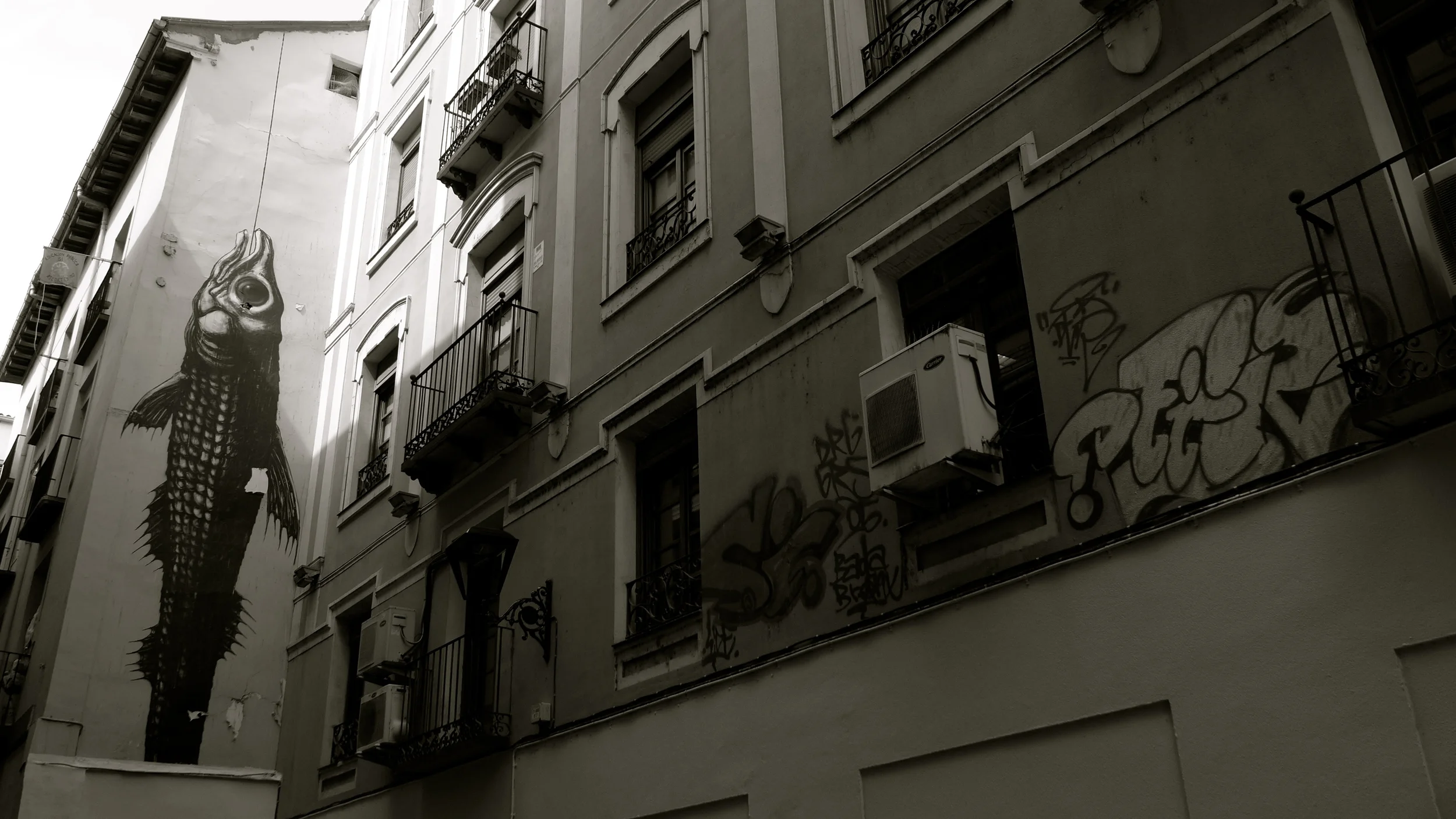El artista belga Roa, estando en Ailanthus Z supo que, en el río Ebro, los siluros, silurus glanis, estos grandes peces, cazan palomas. La noticia le inspiró la obra que plasmó, en el Festival Internacional de Arte Urbano, Asalto, en la calle Don Pedro Atarés. Como se puede ver en la fotografía, tomada hace dos años, el siluro ha perdido su cola. Ver post anterior.