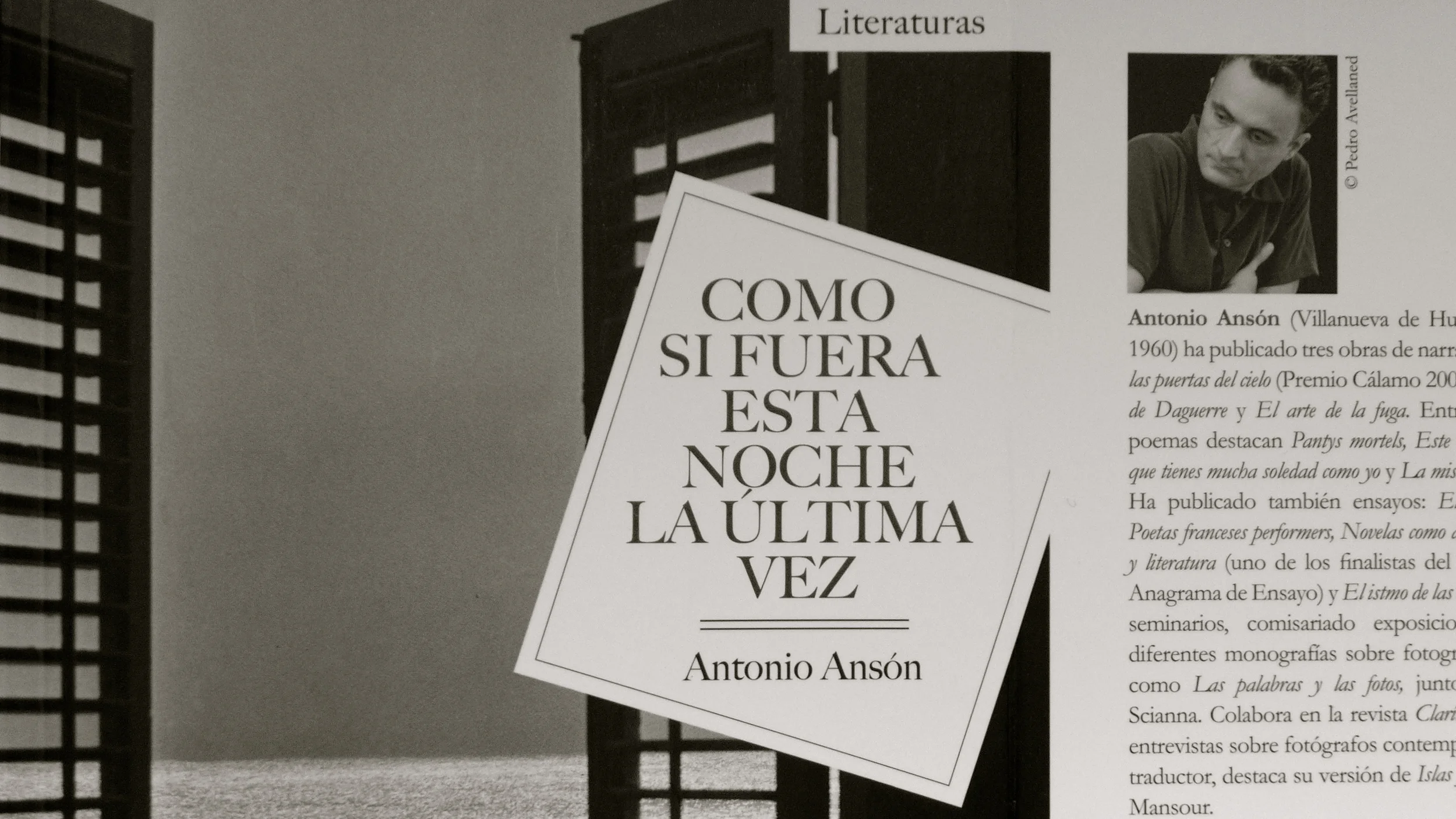 Con elegante discreción, sin hacer ruido, aparece en las novedades de las librerías Como si fuera esta noche la última vez, la última novela de Antonio Ansón. Aun no he tenido tiempo de leerla, lo haré inmediatamente, pero no me resisto a hablar de ella de lo que se deja ver a primera vista. Un sugerente título con sabor a bolero. Una magnífica portada. Un blanco y negro de Ferdinando Sciana y un retrato del autor firmado por Pedro Avellaned, de quien acabo de citar hace dos post. Está dedicado: "A mis madres".