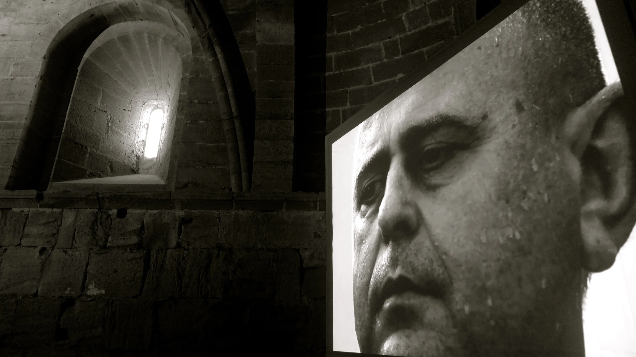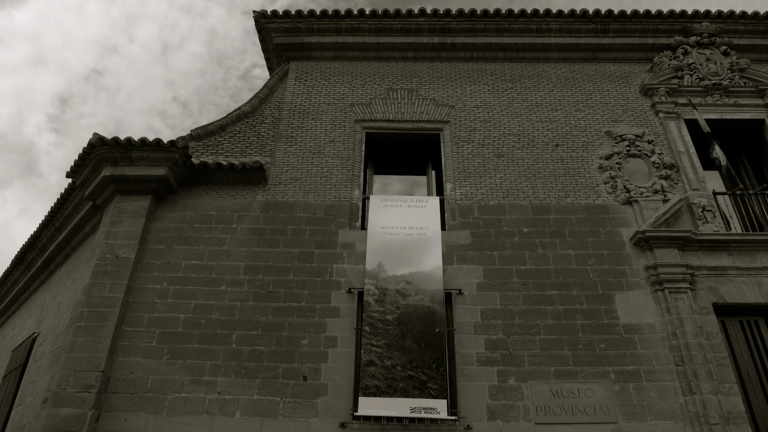 Exterior del Museo con la banderola que anuncia Infranqueable, la exposición de Javier Almalé y Jesús Bondía. Abajo: detalle del audiovisual de la citada exposición.