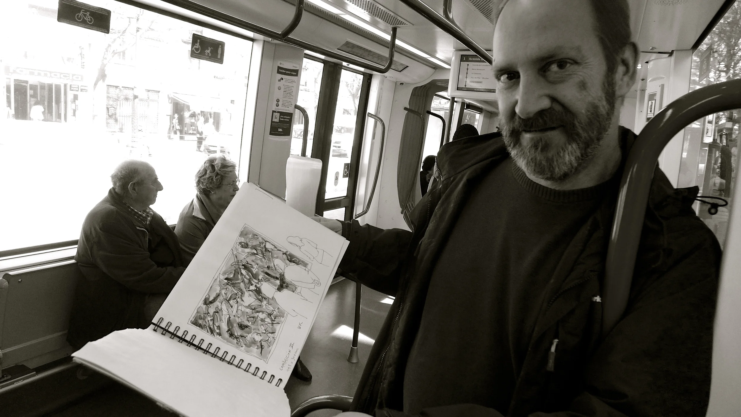Coincido con Fernando Bayo en el bus. Lleva su bloc de dibujos. Los colgará luego en su blog: