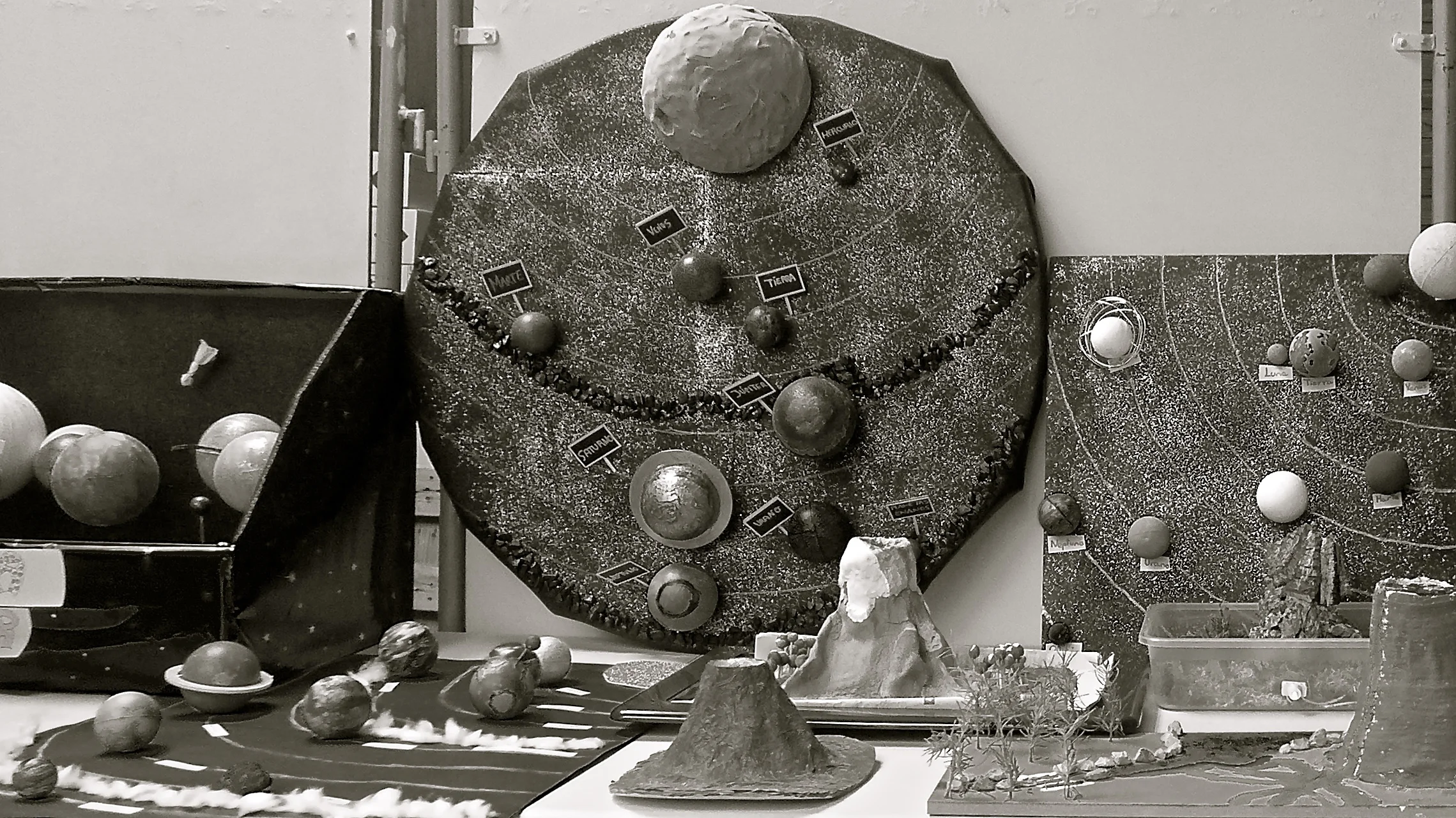 Esta es la última fotografía que he tomado hoy cuando pasaba por delante del colegio Montessori. Son trabajos de los alumnos. Planetas y volcanes. Como no tengo ninguna foto de Waii-waii pero he visto que en sus dibujos abundan los volcanes pues eso: que la cuelgo.