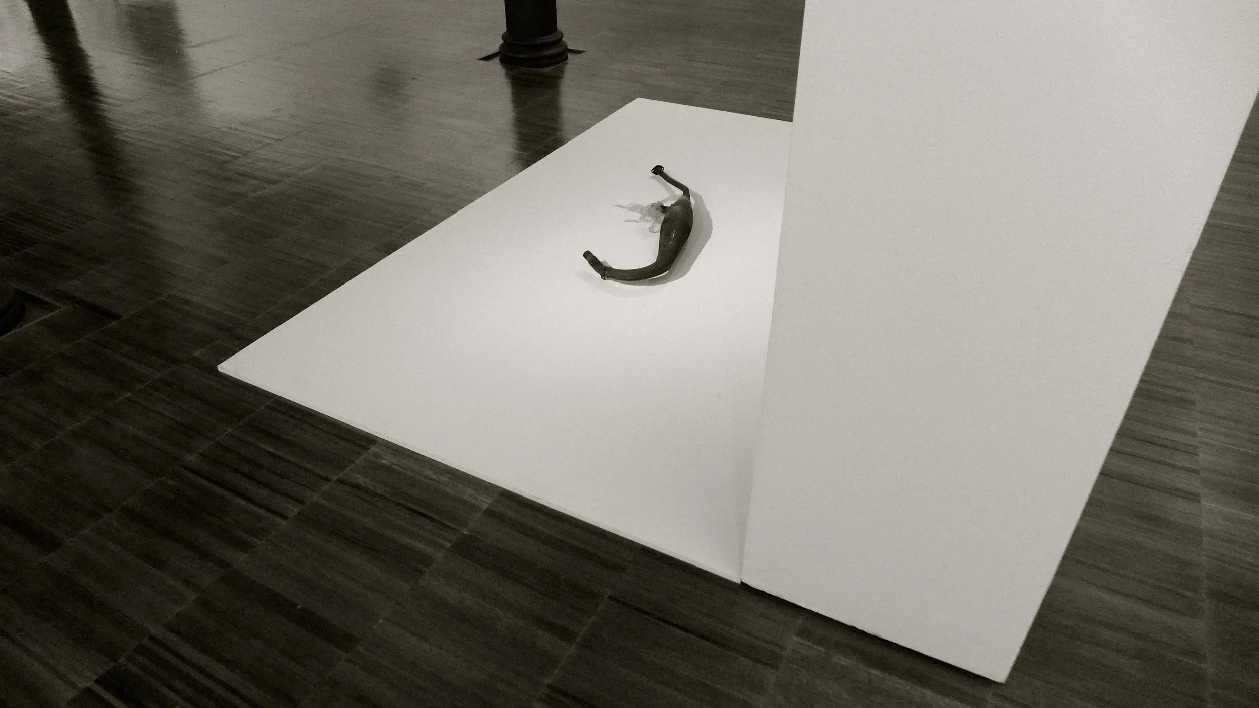 "Feto", 2016 de Charo Pradas yace al abrigo de "Reorientaciones", 2016, Instalación. Muro en DM. de Sandra Montero (ver Trizas de tiza 04).