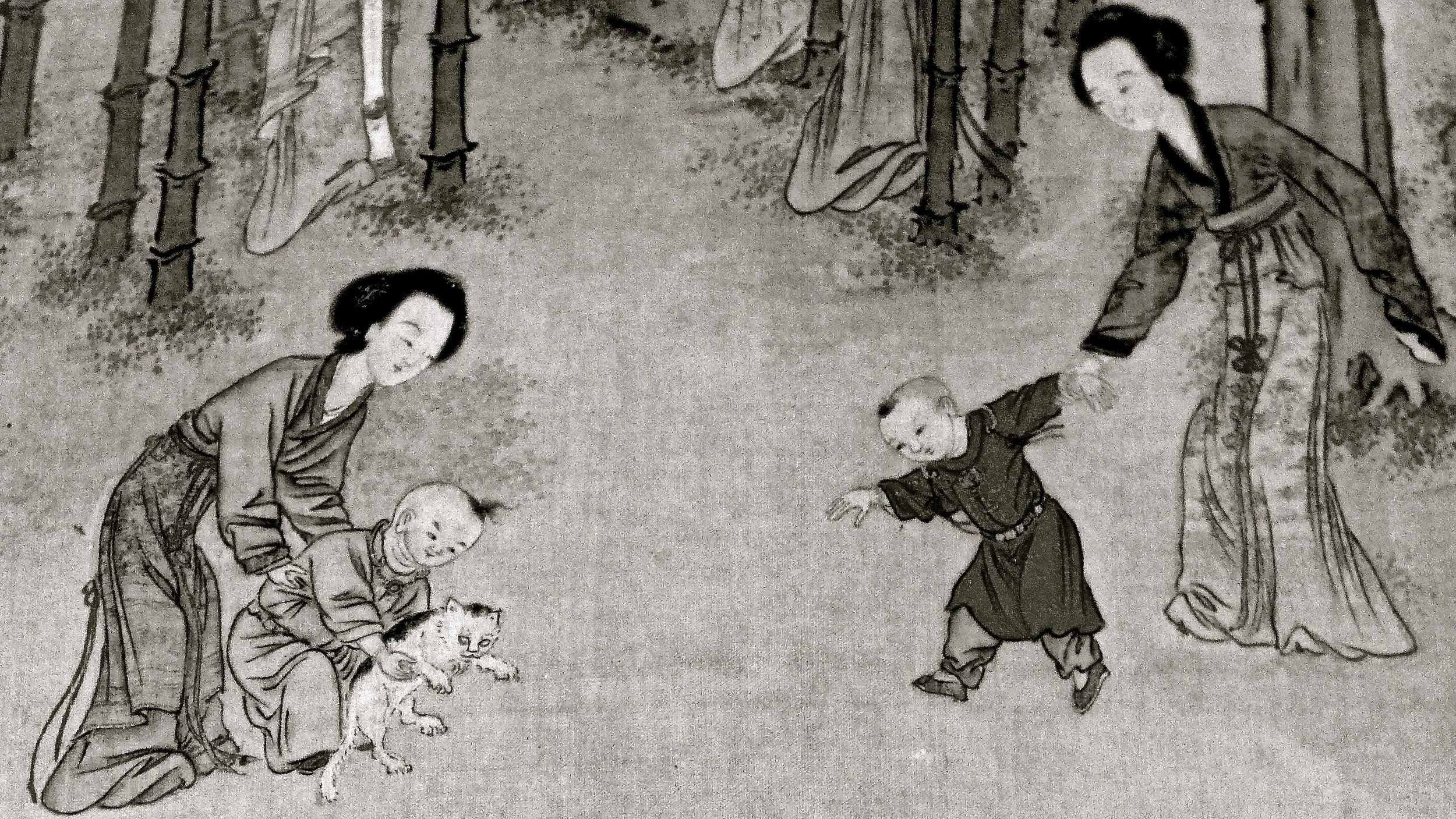 Detalle de "Mujeres ociosas de una antigua dinastía". Pintura sin firmar en rollo horizontal. Comienzos del periodo Qing, un periodo ligeramente posterior al de la dinastía Ming.